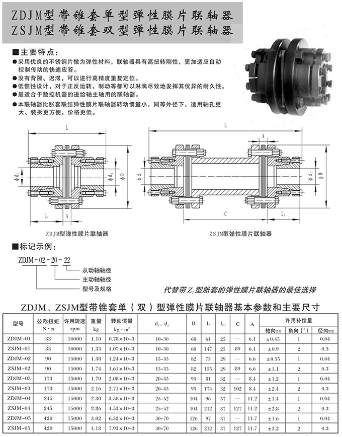 瑞安市寶德隆機械配件有限公司提供ZDJM型帶錐套單型彈性膜片聯(lián)軸器ZSJM型帶錐套雙型彈性膜片聯(lián)軸器具有拆裝方便,快速安裝等特點,廣泛用于連接/固定輪轂孔和零件的軸,例如齒輪,錐齒輪,鏈輪,葉輪,凸輪,皮帶輪和飛輪等軸的聯(lián)結固定,咨詢電話:18906872378