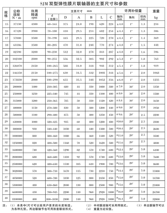 瑞安市寶德隆機(jī)械配件有限公司提供SJM型鍵聯(lián)結(jié)雙型彈性膜片聯(lián)軸器具有拆裝方便,快速安裝等特點(diǎn),廣泛用于連接/固定輪轂孔和零件的軸,例如齒輪,錐齒輪,鏈輪,葉輪,凸輪,皮帶輪和飛輪等軸的聯(lián)結(jié)固定,咨詢電話:18906872378