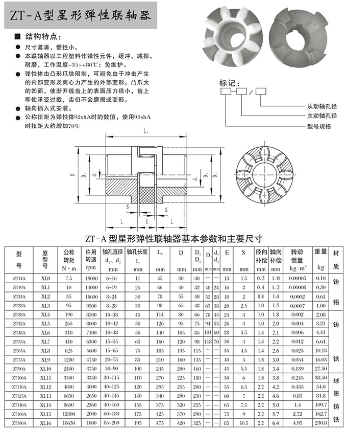 瑞安市寶德隆機械配件有限公司提供ZT-A型星形彈性聯軸器具有拆裝方便,快速安裝等特點,廣泛用于連接/固定輪轂孔和零件的軸,例如齒輪,錐齒輪,鏈輪,葉輪,凸輪,皮帶輪和飛輪等軸的聯結固定,咨詢電話:18906872378