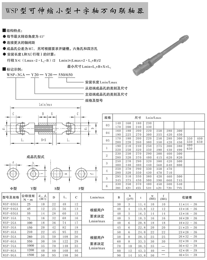 瑞安市寶德隆機械配件有限公司提供WSP型可伸縮小型十字軸萬向聯(lián)軸器具有拆裝方便,快速安裝等特點,廣泛用于連接/固定輪轂孔和零件的軸,例如齒輪,錐齒輪,鏈輪,葉輪,凸輪,皮帶輪和飛輪等軸的聯(lián)結固定,咨詢電話:18906872378