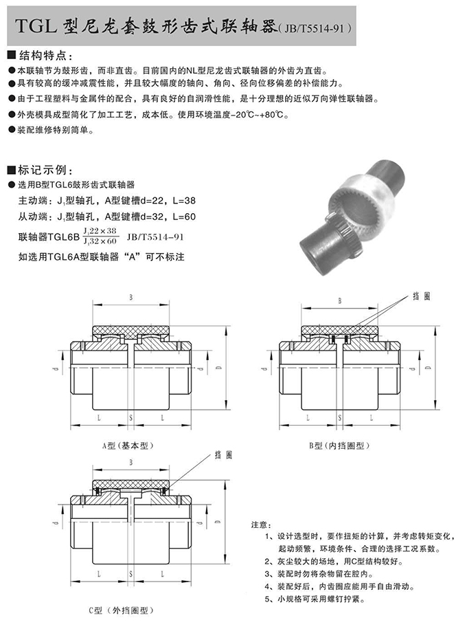瑞安市寶德隆機(jī)械配件有限公司提供TGL型尼龍?zhí)坠男锡X式聯(lián)軸器具有拆裝方便,快速安裝等特點(diǎn),廣泛用于連接/固定輪轂孔和零件的軸,例如齒輪,錐齒輪,鏈輪,葉輪,凸輪,皮帶輪和飛輪等軸的聯(lián)結(jié)固定,咨詢電話:18906872378